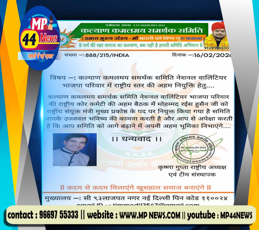 *KHABAR : कल्याण कमलमय समर्थक समिति नेशनल वालिंटियर भाजपा परिवार द्वारा मोहम्मद रईस हुसैन को राष्ट्रीय स्तर की अहम नियुक्ति, पढ़े MP44 NEWS की खबर*